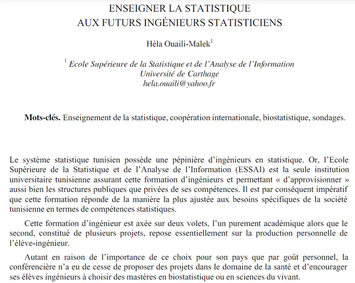 Le système statistique tunisien possède une pépinière d’ingénieurs en statistique. Or, l’EcoleSupérieure de la Statistique et de l’Analyse de l’Information (ESSAI) est la seule institution universitaire tunisienne assurant cette formation d’ingénieurs et permettant « d’approvisionner » aussi bien les structures publiques que privées de ses compétences. Il est par conséquent impératifque cette formation réponde de la manière la plus ajustée aux besoins spécifiques de la société tunisienne en termes de compétences statistiques.