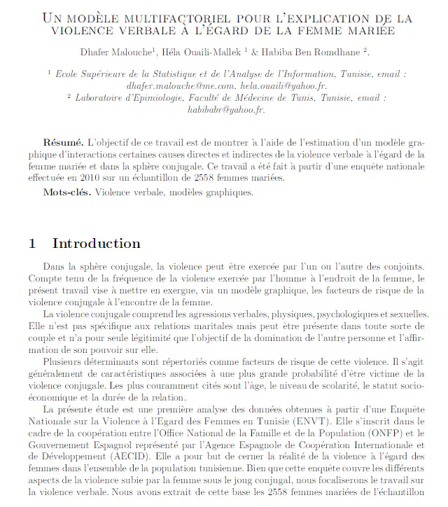 L’objectif de ce travail est de montrer à l’aide de l’estimation d’un modèle graphique d’interactions certaines causes directes et indirectes de la violence verbale à l’égard de la femme mariée et dans la sphère conjugale. Ce travail a été fait à partir d’une enquête nationale effectuée en 2010 sur un échantillon de 2558 femmes mariées.